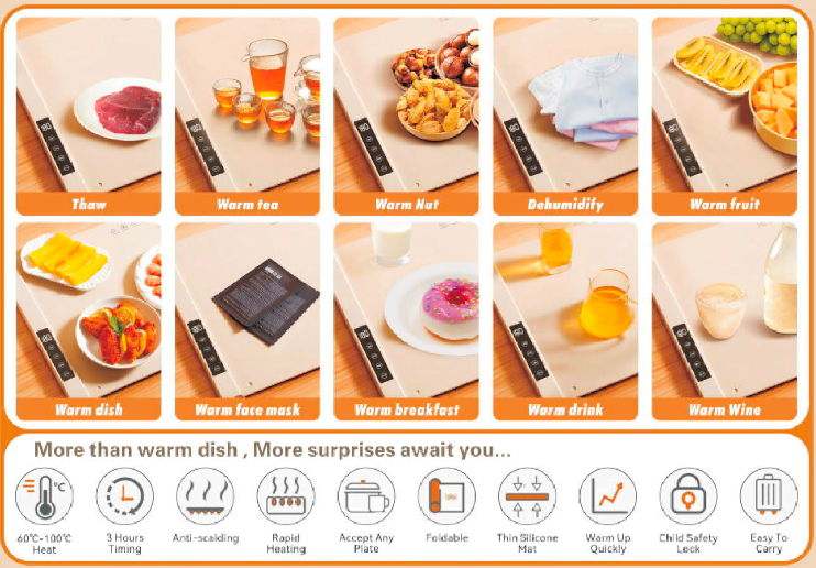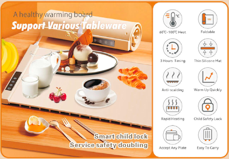 Food Warmer Even heating, adjustable temperature – ideal for family meals and catering. Even Heating Technology Compact & Portable Large Heating Area Food Warmer Series Even heating, adjustable zones – OEM/ODM ready for your brand. Food Warmer 60℃ – 100℃ HeatFoldable3 Hours Timing Thin Silicone MatAnti-scaldingWarm Up QuicklyRapid HeatingChild Safety LockAccept Any PlateEasy to Carry Contact Now